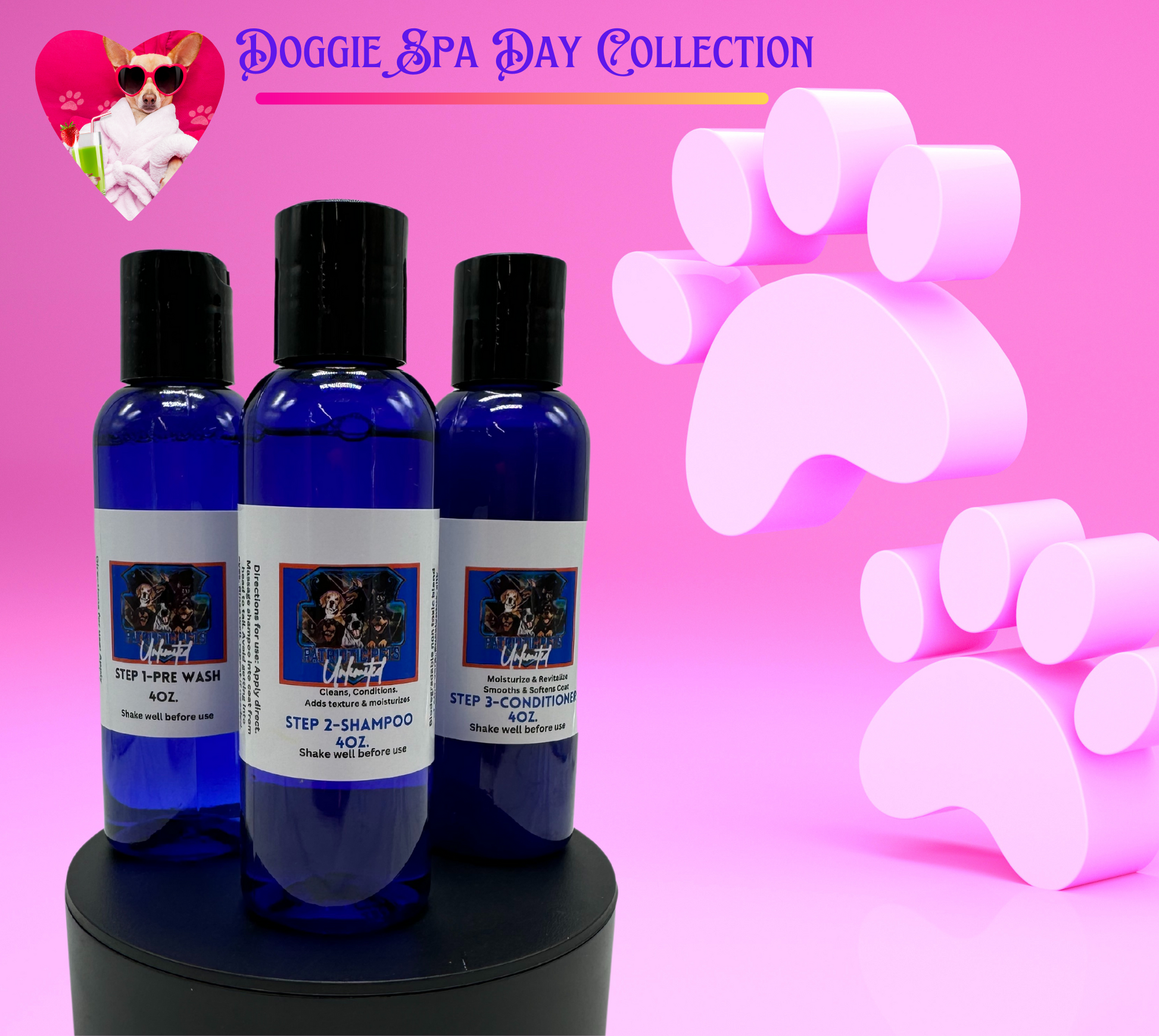 Introducing our all-natural Doggie Prewash, Shampoo & Conditioner combo! Perfectly crafted for your furry friend, this soft and gentle formula ensures your pup will be squeaky clean and smelling oh-so-good! Keep your canine content and give them the quality care they deserve. (Is that tail wagging or just excitedly anticipating the bath?)