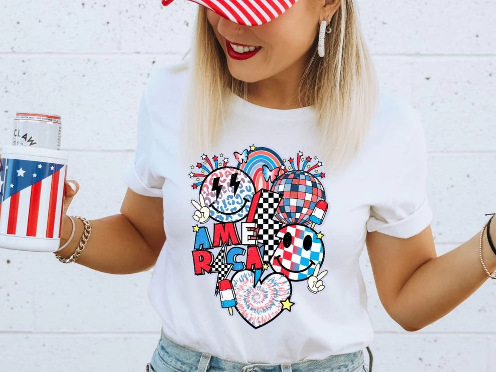 Show off some American pride with our America Happy Faces T-Shirts! Each shirt features a design of smiling faces crafted with an Americana-inspired color palette! Perfect for keeping comfy and casual or styling up your wardrobe, these cheerful tees will have you smiling from ear to ear!