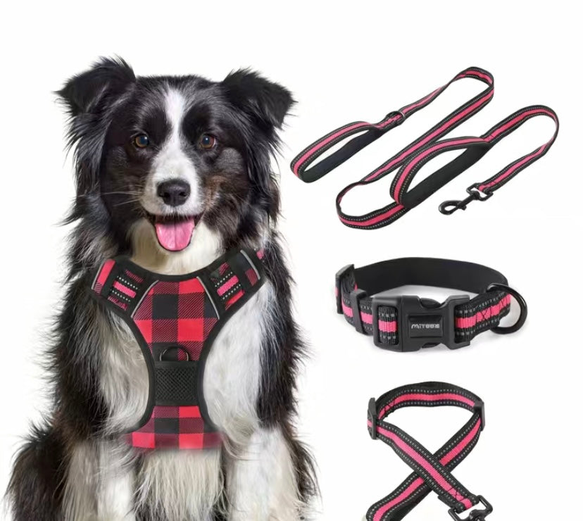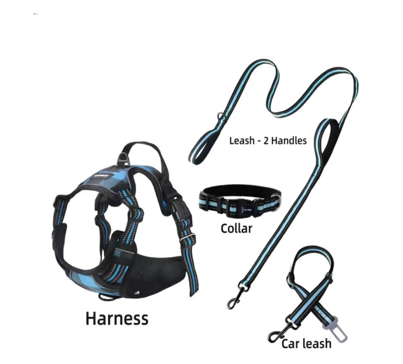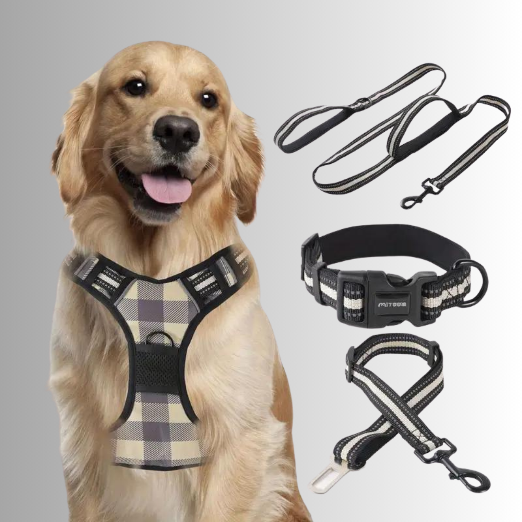 Let your pup hit the trails in style with this 4-piece harness bundle! Perfect for walks, hikes, and car rides, this set includes a harness, collar, leash, and even a seat belt for extra peace of mind. With a little something for every adventure, you and your dog can experience the world together in comfort and safety. WOOF WOOF!