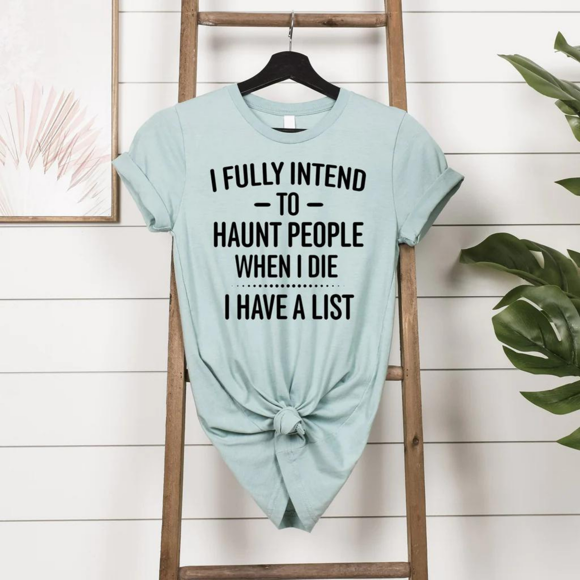 Add some extra spooky vibes to your wardrobe with this "I Fully Intend On Haunting People" t-shirt! Make a lasting impression with a fun, quirky reminder of your otherworldly presence. Seriously, you don't want to miss out on this haunted style! (But don't worry, we promise you won't be the only one with it).