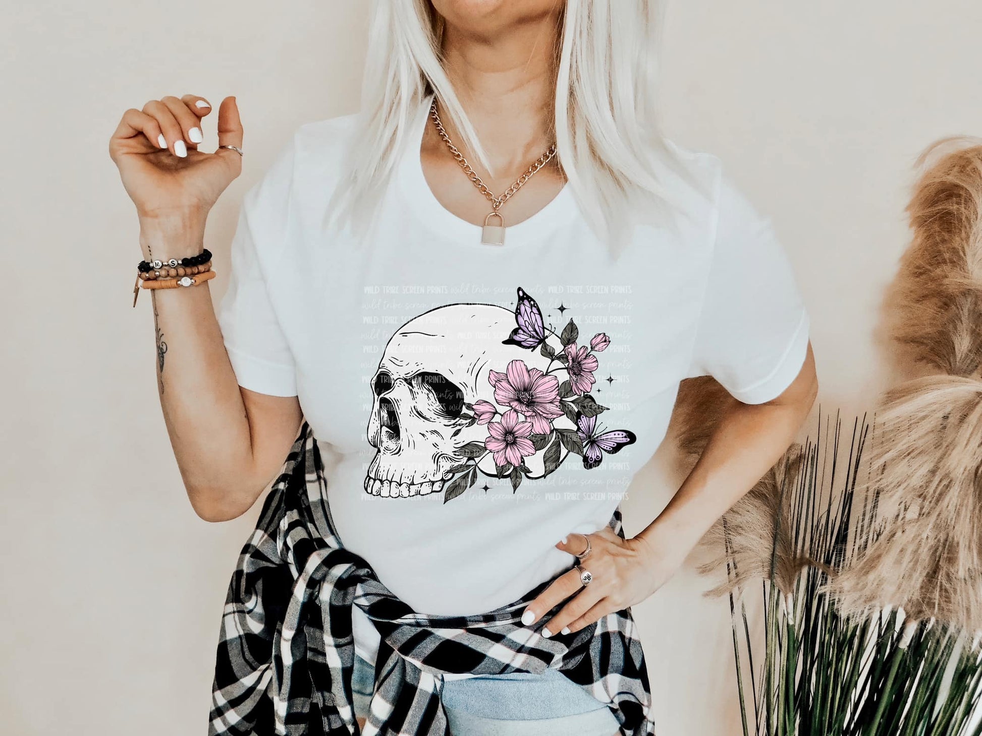 Skull with Butterfly's and Flowers Short Sleeve T-shirt